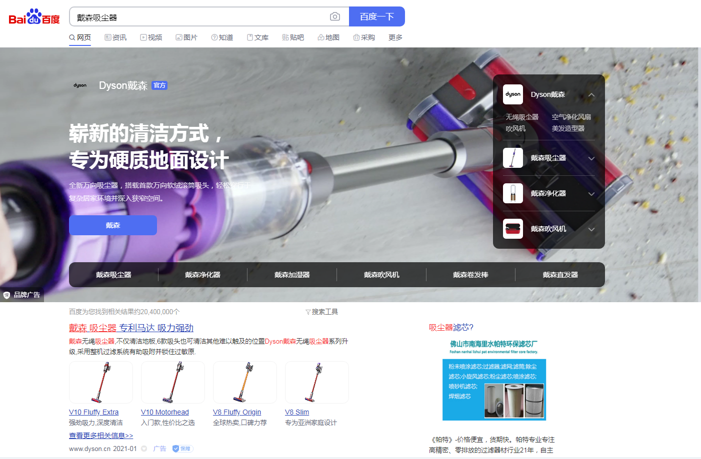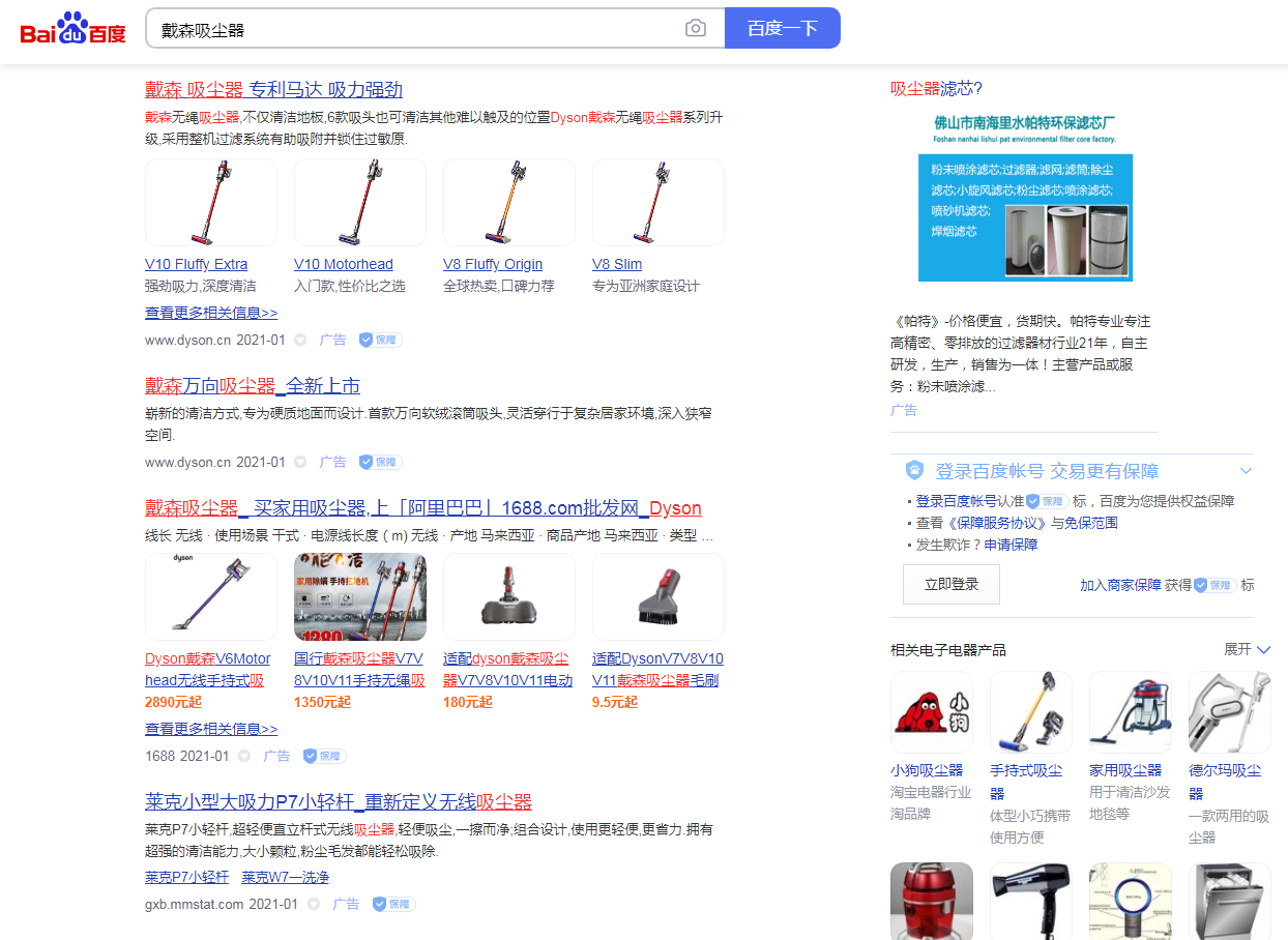 作為中國第一大搜索引擎,百度擁有超過7.5億個網(wǎng)頁的索引,占中國互聯(lián)網(wǎng)搜索查詢量的70%以上,每個月在其搜索引擎上的搜索量高達(dá)數(shù)百億次。所以你可以在百度上探索它的業(yè)務(wù)。有許多不同的方式來利用他們的服務(wù)來向不斷擴(kuò)大的中國市場推廣你的品牌和產(chǎn)品。許多國際品牌都建立了百度官方網(wǎng)站來拓展在中國的市場。戴森是英國的一家電氣公司,是世界上第一家開發(fā)和生產(chǎn)真空吸塵器和無葉風(fēng)扇的公司。而戴森在百度上也有自己的官方網(wǎng)站。圓桌會議可以幫助我們的客戶建立和管理自己的官方網(wǎng)站的市場活動。